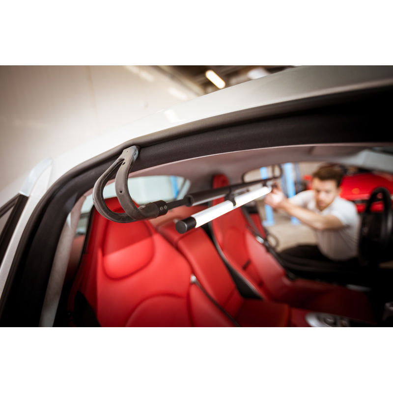 The LED bonnet light is supplied with an adjustable telescopic holder with soft-padded hook ends providing a firm and scratch-free grip on the vehicle. The holder is compact and takes up less space in storage.