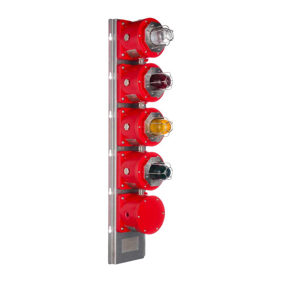 The SL150 is a robust ATEX/IECEx-certified status light array designed for visual signalling in hazardous and corrosive environments. Constructed from UV-resistant GRP and assembled on a 316L stainless steel backplate, it can be configured with up to five LED or Xenon lights. Each light can operate independently or simultaneously, offering steady, flashing, or rotary signals in various colours. SIL2-compliant and IP66/67 rated, the SL150 is ideal for oil, gas, chemical, marine, and offshore applications. Optional features include duty labels, push buttons, and mounting accessories to customise the unit for your site-specific safety requirements.