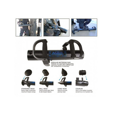 The kit includes a modular body, coupler, and three specialized rams: Standard Ram, Ball Ram, and Cone Ram. Each attachment is purpose-built for different impact tasks, giving teams maximum flexibility in the field. The innovative coupler allows for fast transformation from a one-person battering ram to a powerful two-person configuration in seconds—ideal for situations requiring extra force.