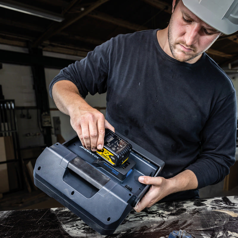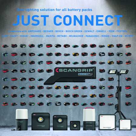 VEGA 4 CONNECT is compatible with METABO/CAS battery system 18 V and all other 18 V/ 20 V battery packs from leading power tool brands by using the SCANGRIP CONNECTOR. In addition, the SCANGRIP POWER SUPPLY can be used for direct power providing unlimited availability to light.